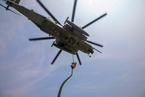 Marine Corps Cpl. Derian Webber fast ropes from a CH-53E Super Stallion during a course at Marine Co... Photo Details >