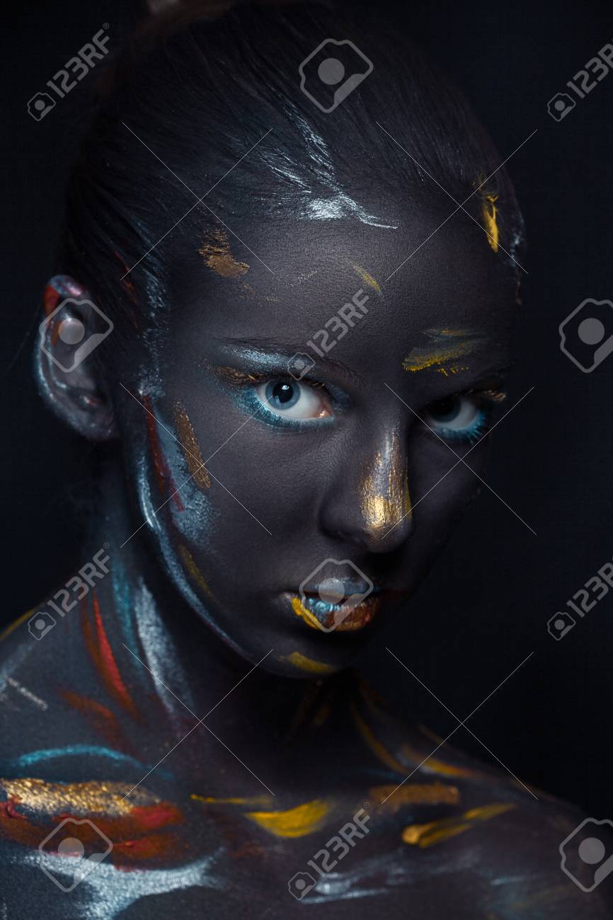 Portrait D'une Jeune Femme Qui Pose Recouverte De Peinture Noire Dans Le Studio Sur Un Fond Noir Banque D'Images Et Photos Libres De Droits. Image 51375424.