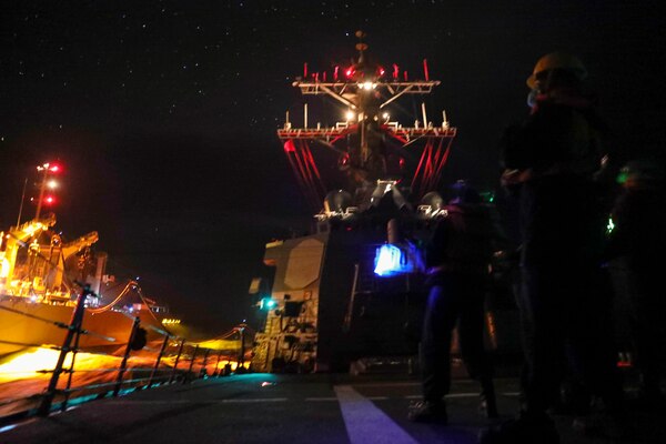 Sailors aboard the USS Ross conduct a replenishment with the USNS Supply in the Mediterranean Sea, D... Photo Details >