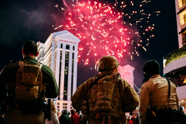 A soldier works with law enforcement during a firework show in Las Vegas, Jan. 1, 2022. Photo Details >