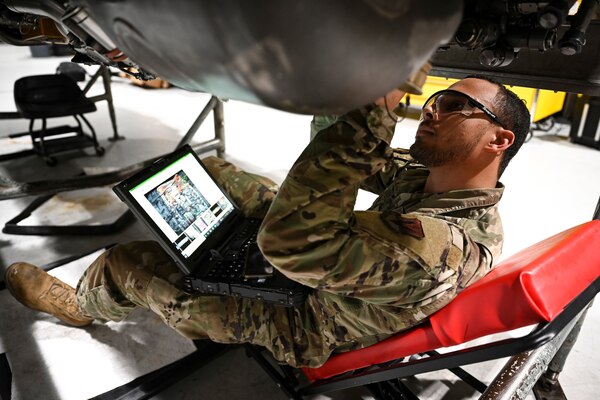 Air Force Airman 1st Class Rio Brownlee works on the underside of an F-16 Viper engine at Shaw Air F... Photo Details >