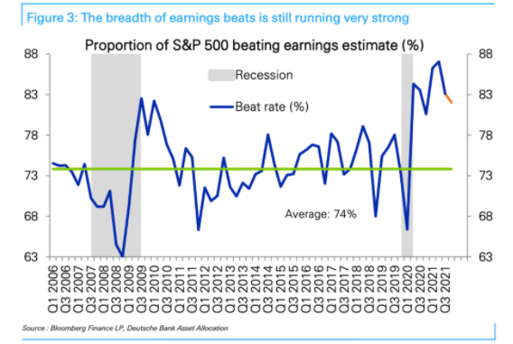 First, most companies usually report earnings that beat these estimates. Check out the chart below from Deutsche Bank's Binky Chadha.