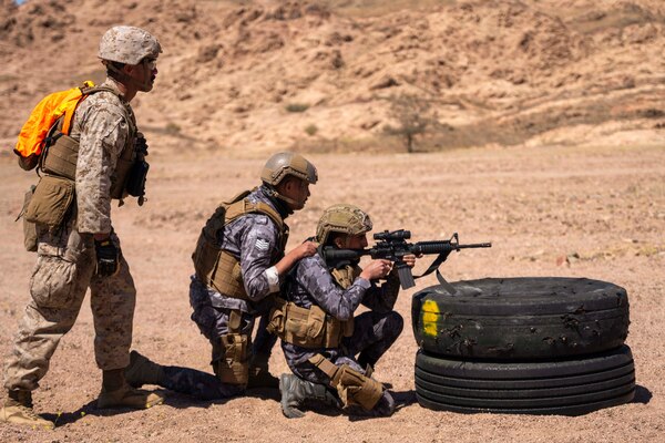 A U.S. Marine and Jordanian Marines conduct rifle training during Intrepid Maven, a bilateral exerci... Photo Details >