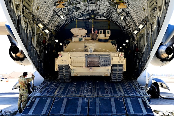 Air Force airmen assigned to the 816th Expeditionary Airlift Squadron unload an Army M1A2 Abrams mai... Photo Details >