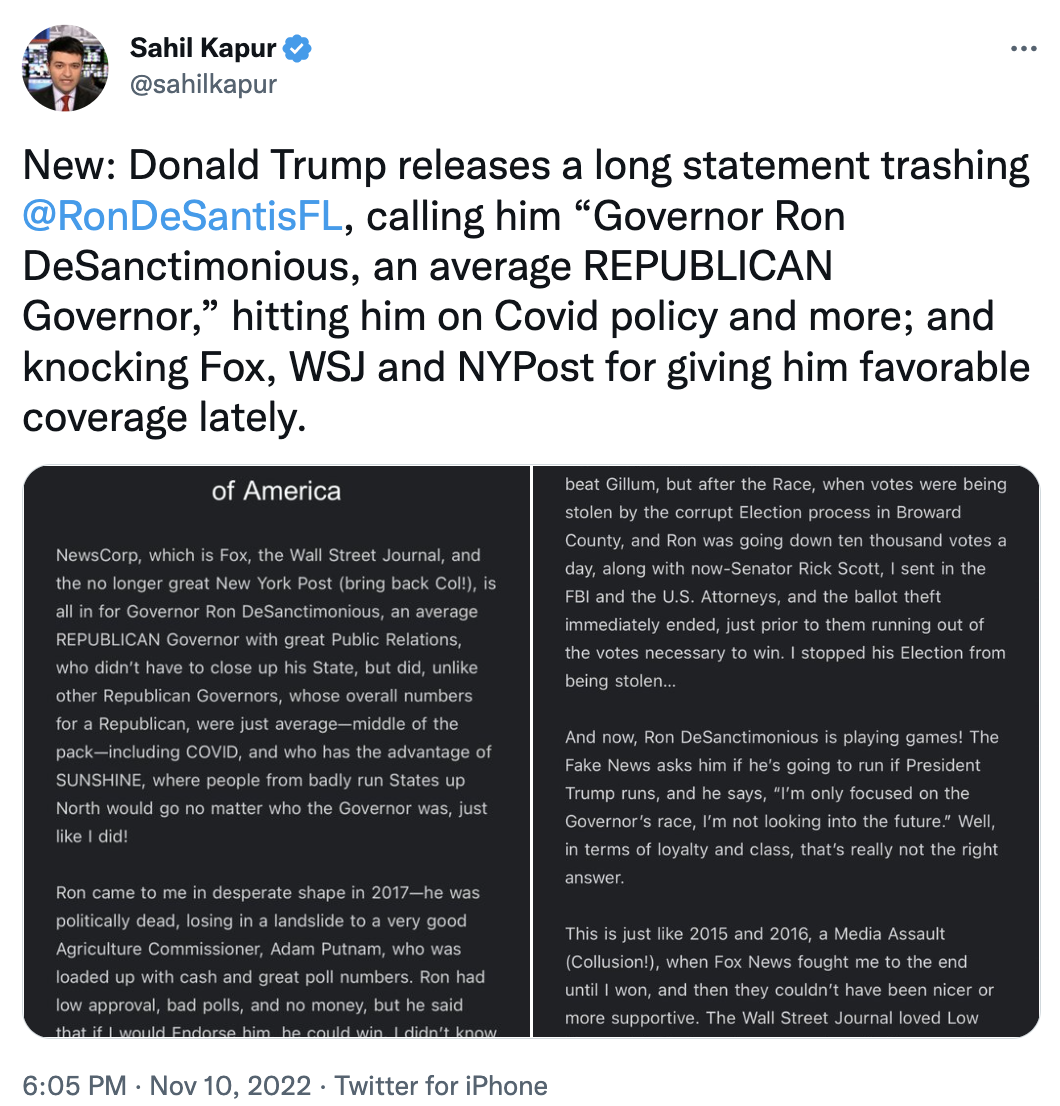 If it's FRIDAY… GOP needs to win seven of 27 uncalled House races for a majority; Dems need 21… In AZ-SEN, Democratic Sen. Mark Kelly is ahead of Republican Blake Masters by 115,000 votes with 80% in… In NV-SEN, Republican Adam Laxalt leads by just shy of 9,000 votes with 88% in… The first TV ad of the GA-SEN runoff is already on the air... NBC News projects midterm turnout at 112.5 million – down slightly from record 2018 election… Donald Trump lashes out at Ron DeSantis… And Gen Z's first elected member of Congress, Maxwell Frost, gets a shoutout at The 1975 concert in DC. But FIRST… Two pivotal events took place between Nov. 2021 (when Republicans won statewide in Virginia and almost won in New Jersey) and Nov. 2022 (when the GOP wave fizzled out). The Dobbs decision and Donald Trump's reappearance as the GOP's unquestioned leader. On Dobbs, the national exit poll showed 27% of voters picking abortion as their No. 1 issue (just behind inflation at 31%), and those voters backed Democratic candidates by a 76%-23% margin. What's more, 59% said abortion should be legal in all or most cases, versus 36% who said it should be illegal in all or most cases. And as our NBC News poll showed, Democratic enthusiasm soared after the May leak of the Dobbs decision. |