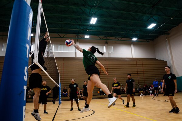 Army Staff Sgt. Alyssa Sarandos spikes a volleyball during a game at Fort Stewart, Ga., Nov. 30, 202... Photo Details >