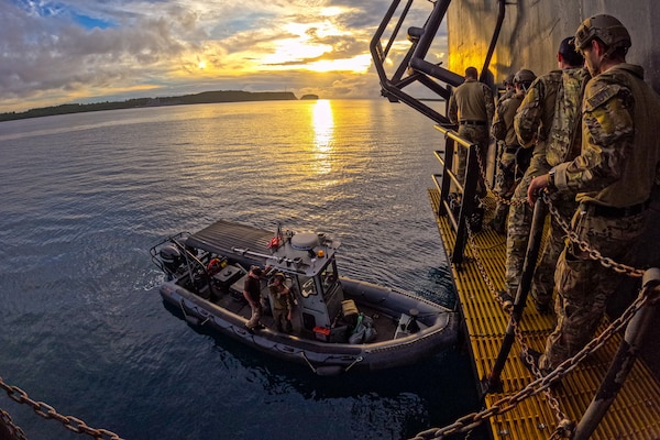 Sailors conduct an at-sea damage repair exercise involving a simulated explosive hazard aboard the U... Photo Details >
