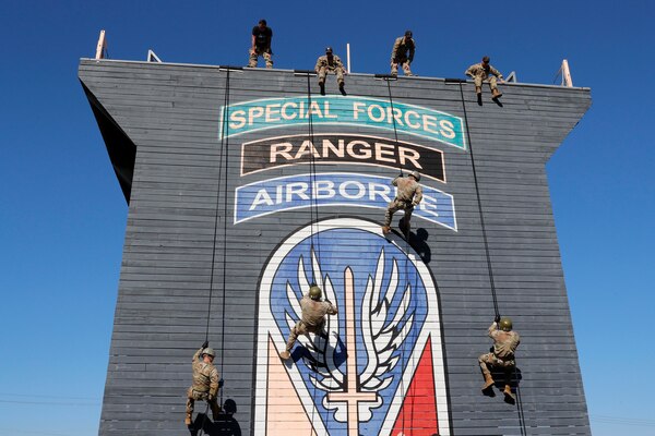 Army air assault students practice rappelling from a tower at the Joint Readiness Training Center at... Photo Details >