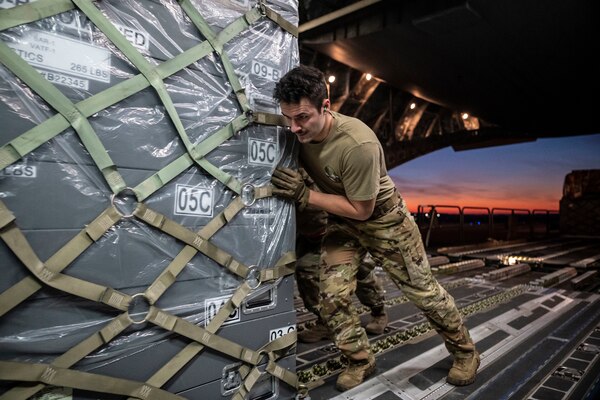 Air Force Senior Airman Garrett LaMarche, a loadmaster assigned to the 6th Airlift Squadron, pushes ... Photo Details >