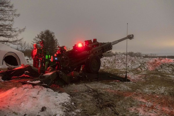 Marines prepare to fire an M777 towed 155 mm howitzer while conducting night live-fire training as p... Photo Details >
