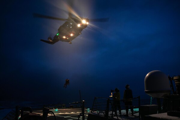 The guided missile destroyer USS Arleigh Burke participates in helicopter flight operations in the N... Photo Details >
