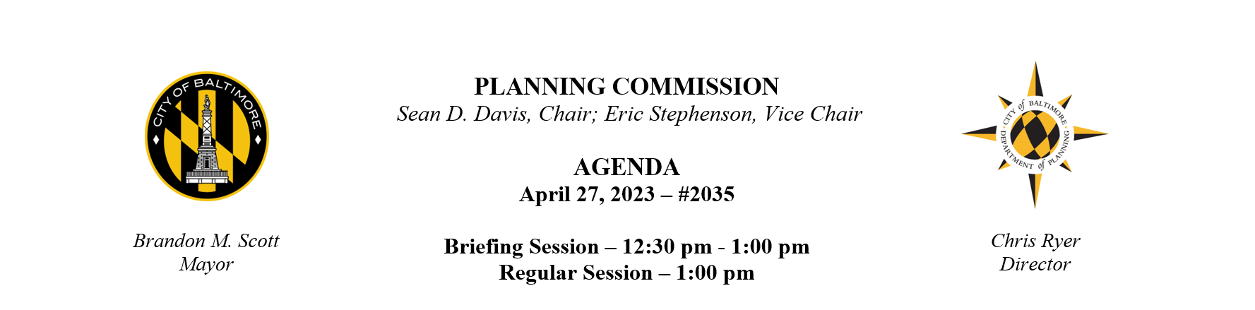 This meeting will be conducted in-person. We are working to include a remote video conference option in a "hybrid" meeting format for future meetings, though it is not available for this meeting. Please check the Planning Commission agenda webpage frequently for updates and participation instructions: https://pc.baltimorecity.gov/2023-agendas