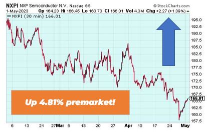 | Good morning Wake-up Watchlisters! While you're sipping coffee you'll see stock futures declined on Tuesday. The drop came after Australia's central bank stirred speculation that global policy makers will extend tightening cycles. Euro zone data is also reinforcing these fears, showing banks had curbed lending more than anticipated. Urgent: With the latest rate hike likely coming tomorrow, it's crucial to consider Karim Rahemtulla's latest "Super Income System." This portfolio could allow traders to collect income as well as capital gains, but the opportunity could end as soon as the Fed's latest meeting tomorrow. So you have to lock in your investment soon. Click here to get exclusive access to Karim's Super Income portfolio. Here's a look at the top-moving stocks this morning. Chegg, Inc. (NYSE: CHGG) Chegg is down 44.60% premarket after the online-education company said since March it's seen a "significant spike in student interest in ChatGPT" and the new chatbot is impacting its customer growth rate. Chegg now predicts revenue in the second quarter range of $175 million to $178 million, which is below analysts estimates of about $194 million. NXP Semiconductors (Nasdaq: NXPI) NXP Semiconductors is up 4.81% premarket after topping revenue expectations and the Netherlands-based chip maker also issued a strong second-quarter forecast for profit and revenue. The quarterly report represents an earnings surprise of 5.63%. Our Lead Trading Tactician Nate Bear had his eyes on a semiconductor stock in his watchlist yesterday. He got positioned at 11:24 am on Monday and closed for a 100% winner in 1 trading day on NVDA! Click here to start following along with Nate's trades. |