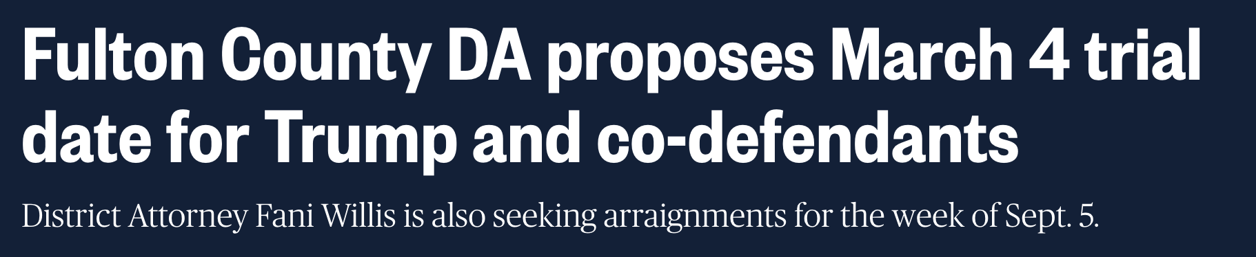 Counter-programming: As former President Donald Trump prepares to travel to Georgia to be booked after his fourth indictment, NBC News' Jonathan Allen, Matt Dixon, Henry J. Gomez and Allan Smith report on the possibility of him doing it on the same day as next week's GOP presidential debate to snatch the headlines away from his rivals.