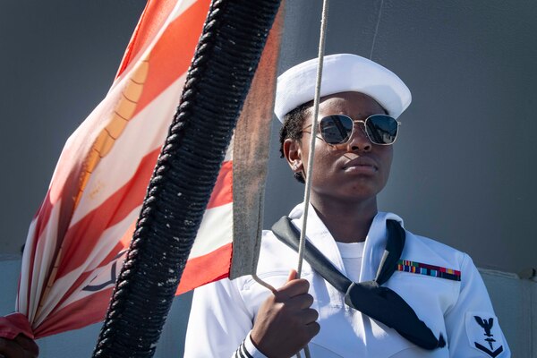 Navy Petty Officer 3rd Class London Halloway prepares to raise the colors aboard the USS Blue Ridge ... Photo Details >