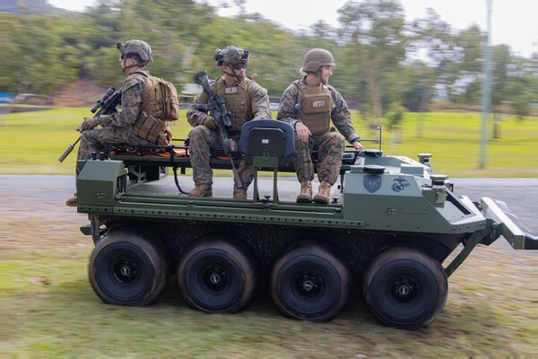 Marines and sailors ride an unmanned ground vehicle during a medical exercise for Talisman Sabre 23 ... Photo Details >