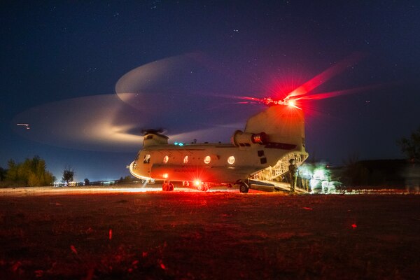 A CH-47 Chinook helicopter lands at night during the Best Warrior competition at Fort Carson, Colo.,... Photo Details >