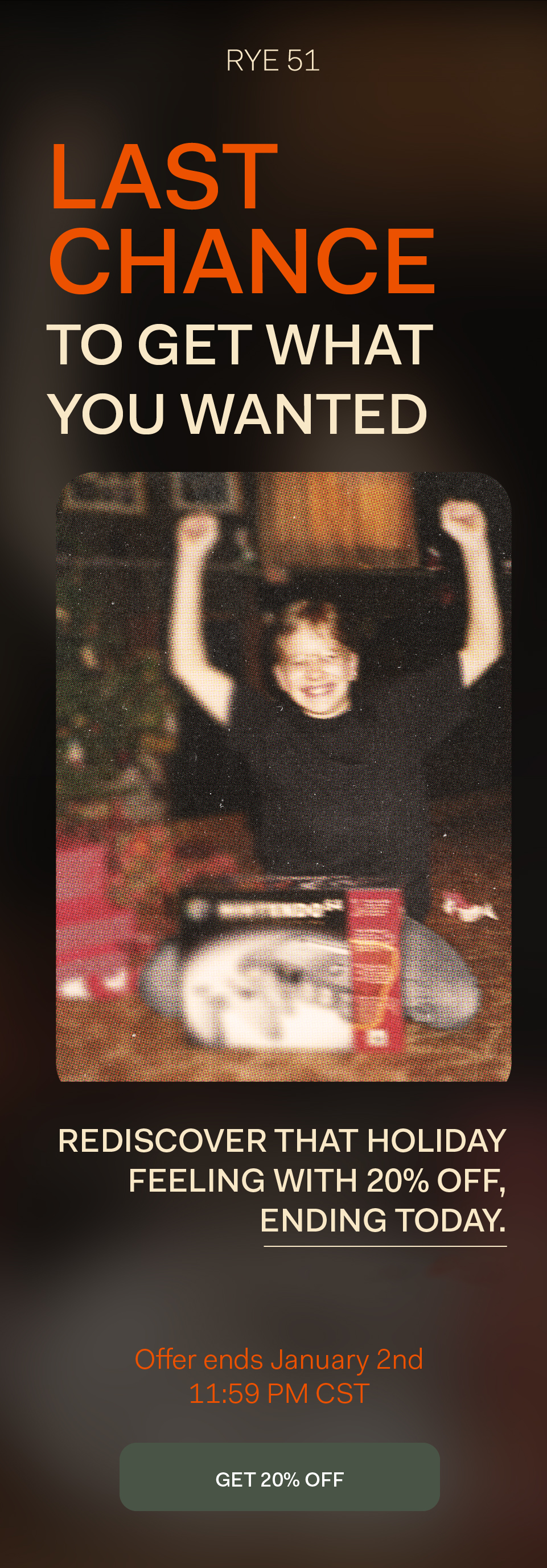 Not valid with any other offer or promotion. Online & In Store. Available on Rye51 products only. Prior Purchases are not eligible for a price adjustment. Discount is applied automatically at checkout. Some exclusions apply. | | Didn't get what you wanted for Christmas? | | From cozy sweaters to sharp jackets, treat yourself to the quality and sophistication you deserve. | | LET'S END THIS FESTIVE SEASON ON A HIGH NOTE. | | Your perfect Rye 51 piece is waiting to jump into your wardrobe and bring that holiday cheer to life. | | | | |