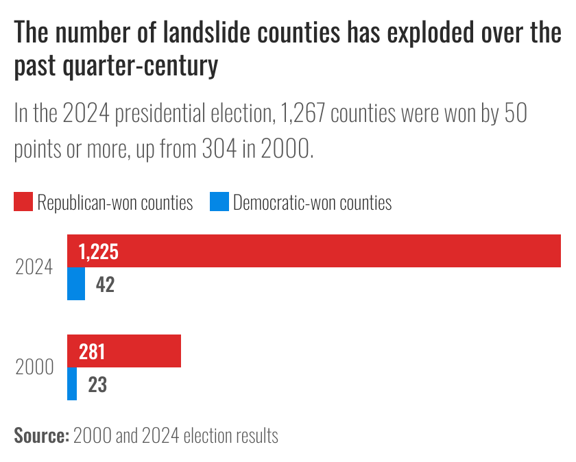 Nationally, the presidential race was close, with Donald Trump besting Kamala Harris by 1.5 points in the popular vote. But at the county level, there were landslides galore. In the 2024 election, 1,267 counties were won by Trump or Harris by margins of 50 points or more. That accounts for just over 40% of all the 3,143 counties in the United States. It also represents a four-fold jump from the number of landslide counties a generation ago, when the narrow 2000 contest between George W. Bush and Al Gore (where the popular vote margin was 0.5 points) yielded just 304 of them. The number of landslide counties ticked up in the Bush and Barack Obama years before exploding in 2016, the first of three straight races with Trump at the top of the GOP ticket. |