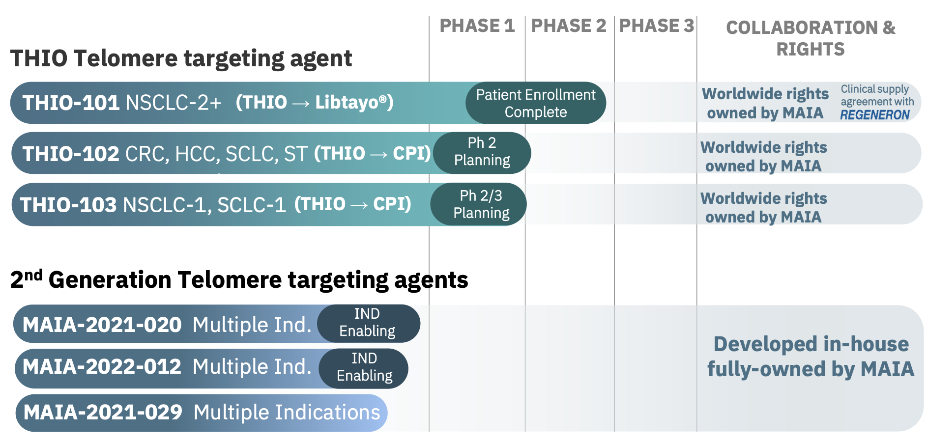 MAIA has initiated an early-stage research and discovery program aimed at identifying new compounds capable of acting through similar mechanisms of activity as THIO, such as the targeting and modifying telomeric structures of cancer cells through cancer-cell intrinsic telomerase activity. The main objective for this program is to discover new compounds with potentially improved specificity towards cancer cells relative to normal cells and with potentially increased anticancer activity. This program may also allow us to strengthen their patent portfolio. Although the program is in early stages and they may not be able to identify suitable compounds, they believe they will be able to create a second generation of THIO-like compounds.