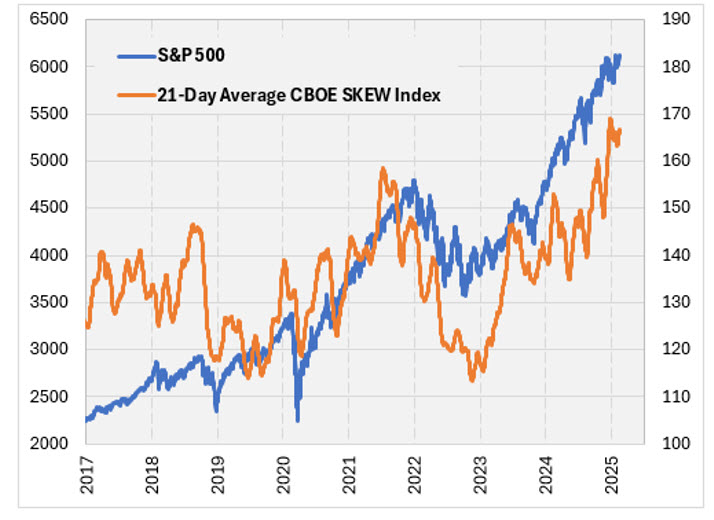 | Large Stock Market Pullback Unlikely, Per This Fear Gauge | | The CBOE Volatility Index (VIX) is widely known as the market's "fear gauge" because it measures expected volatility in the S&P 500 Index (SPX) over the next 30 days, based on at-the-money options. When uncertainty rises or stocks drop, the VIX tends to spike. However, there's another volatility index that may deserve the "fear gauge" title even more: The CBOE Skew Index (SKEW).