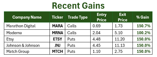 Every month, we send our members 6 high-probability trades, straightforward call and put setups designed to move fast.