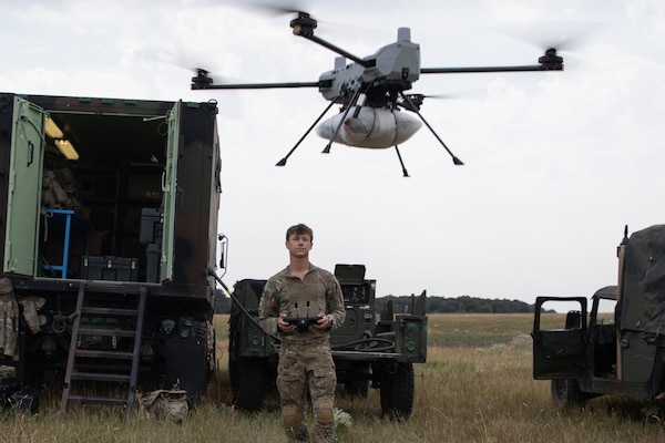 Army Spc. Max Boatner operates a C100 drone during a field demonstration as part of Agile Spirit, a ... Photo Details >