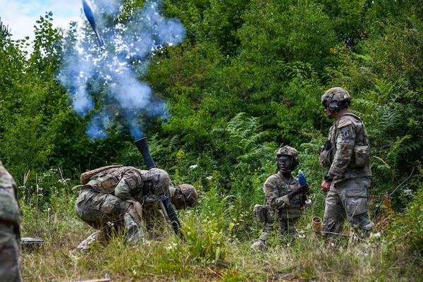 Soldiers fire an M252A1 81 mm mortar system during a live-fire exercise as a part of Eagle Ace at Sl... Photo Details >