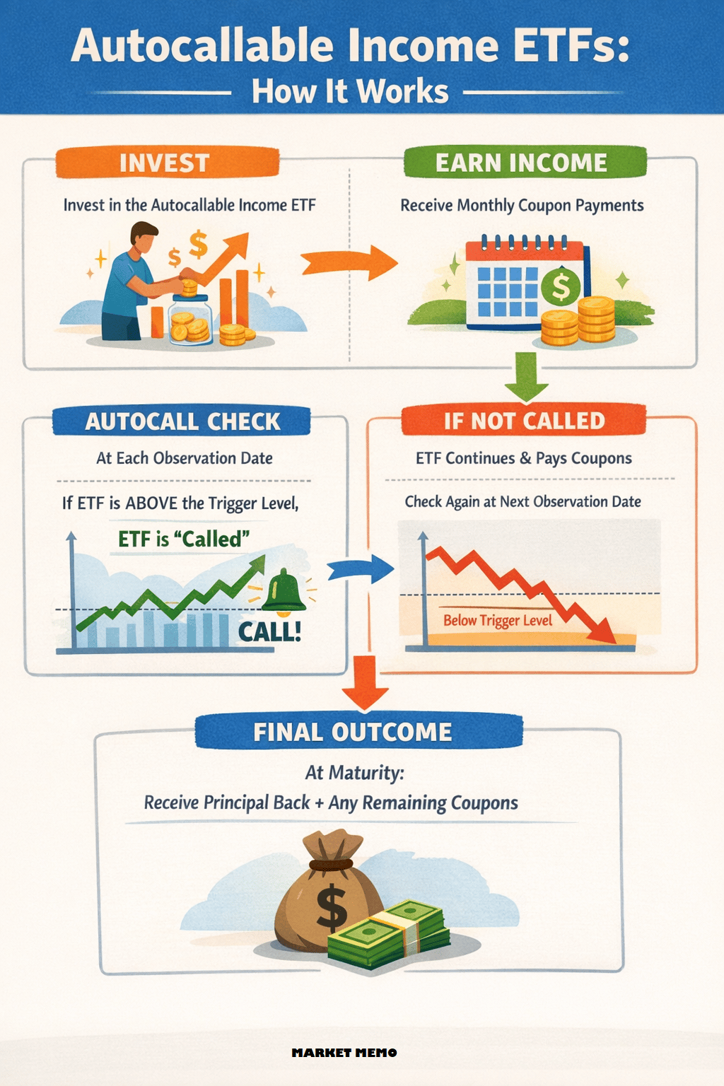 | What is an Autocallable Income ETF? | In simple terms, an Autocallable ETF pays you a high monthly interest rate on your investments (around 1–1.5% per month) as long as the stock market doesn't crash. | The good news: you can earn around 14–18% per year if the market remains stable. The limitation: if the market rises 50%, your gains are capped at those monthly payments. If the market drops more than 30% (the maturity barrier), you could lose money.