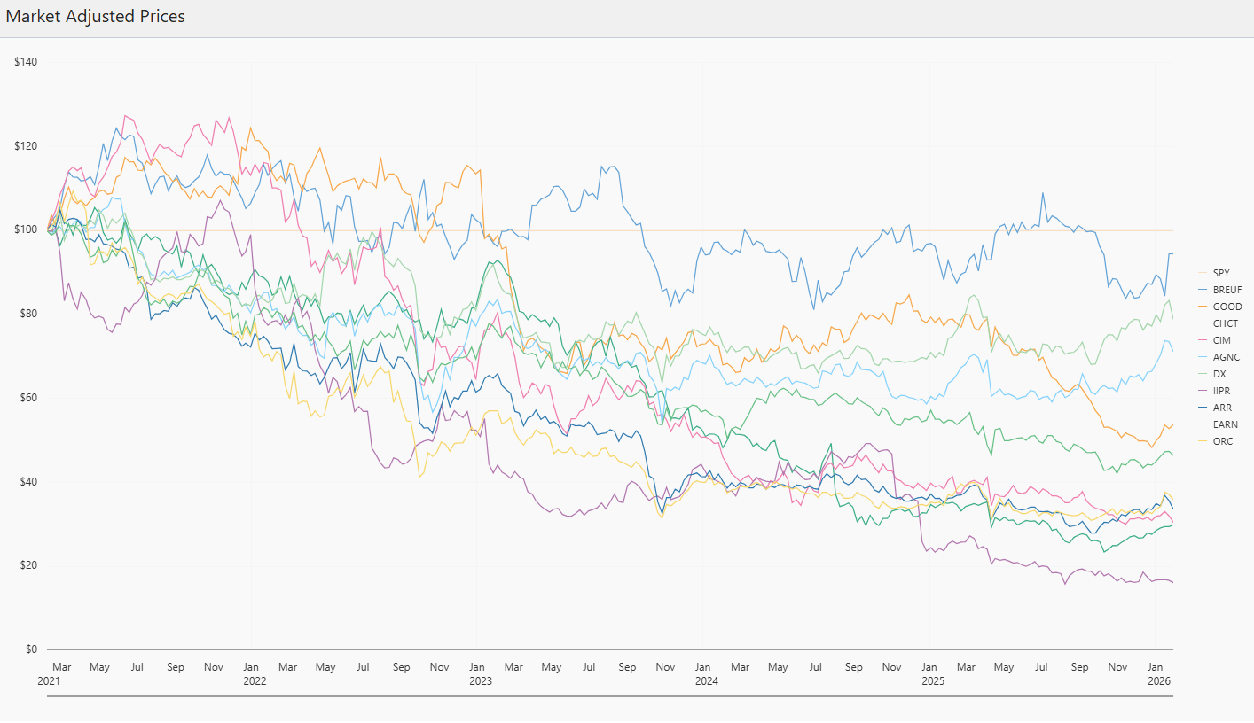 | Chart compares the market-adjusted returns of selected high-yield REITs against the S&P 500 (SPY), showing most of the REITs experience persistent underperformance and steady capital erosion, with brief rebounds failing to offset longer-term declines. |