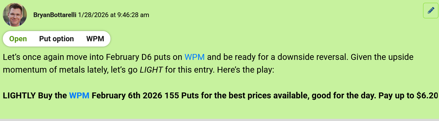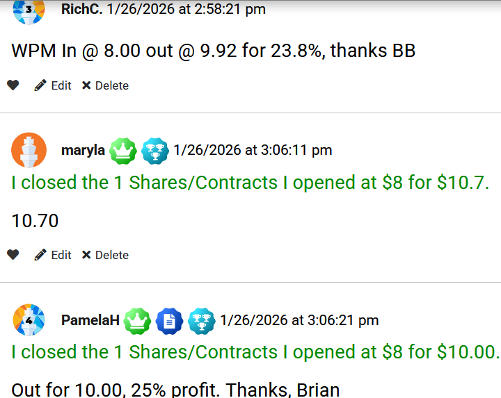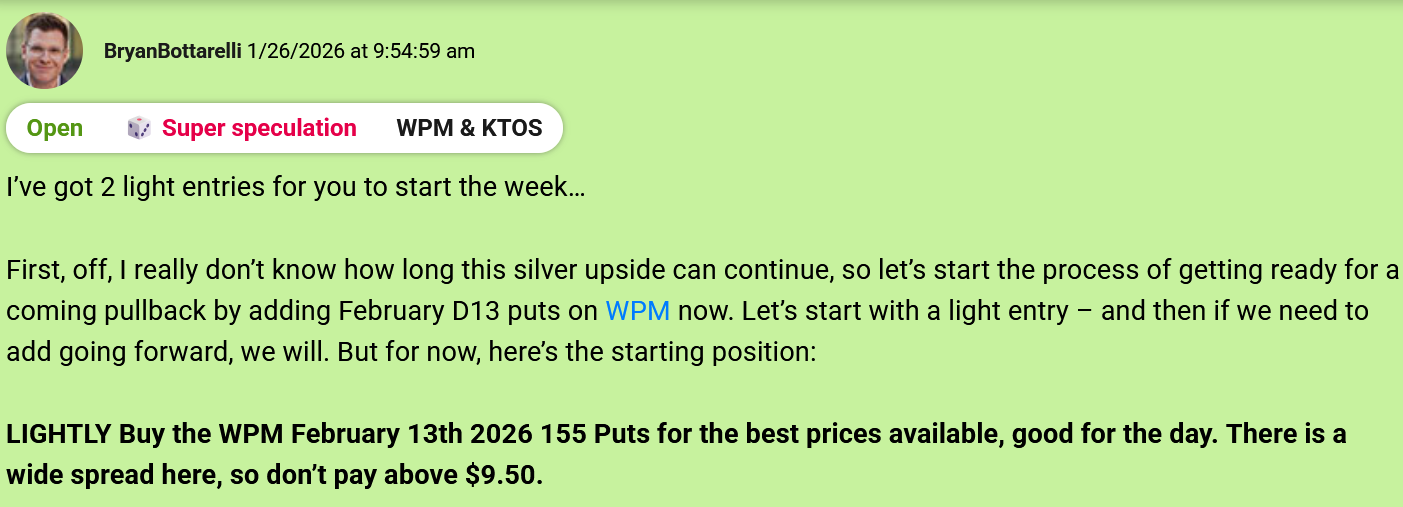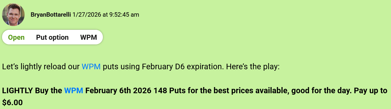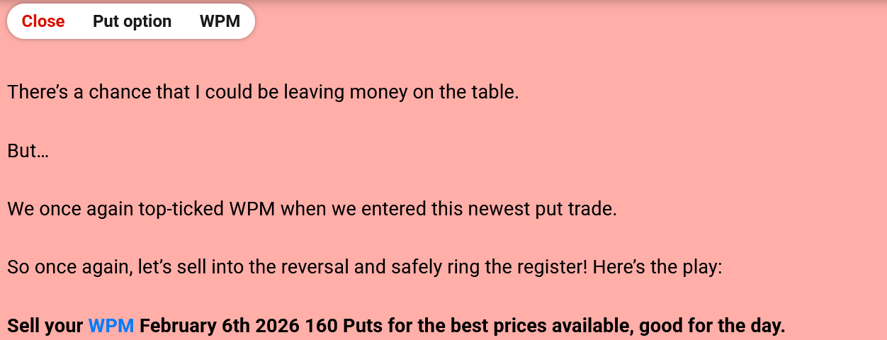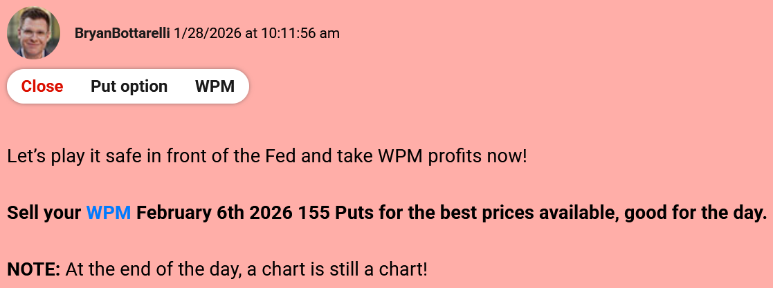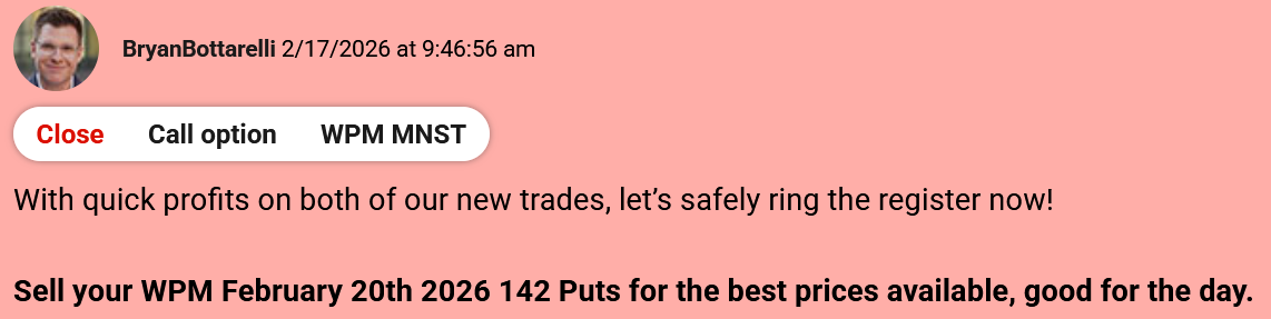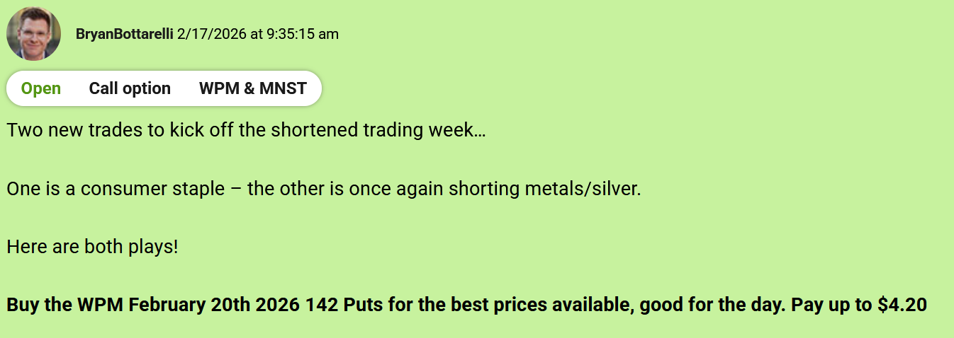 "My strategy for trading silver in 2026 has been simple – short the rallies." Bryan Bottarelli, Co-Founder, Monument Traders Alliance Editor's Note: If you ever wanted to learn how to play volatility like a pro, this is your week. Tomorrow at 2 p.m. ET, our Senior Analyst Chris Johnson is going over three different strategies to help you trade more confidently and manage risk. The event is free for all subscribers. Click below to sign up today. Sign up here. - Stephen Prior, Publisher Metals have been the dominant trade in The War Room this year. And when silver skyrocketed to all-time highs in late January, I knew based on the technicals the upside couldn't last much longer. So I got ready for a pullback in The War Room. One of the companies we bought puts on was Wheaton Precious Metals Corp. (WPM)... And the results have been incredible. In 2026 alone, I've opened 5 put trades on WPM, and closed every single one for a winner. Take a look at the full breakdown... The first trade was a 26% winner in less than 1 trading day. The second trade was a 29% winner in less than 1 hour. The third WPM winner was an 13% winner in less than 1 hour. The fourth trade was an 14% winner in less than an hour. And most recently... I closed a 15% winner yesterday in less than 15 minutes. The truth is… when you understand how metal companies move, a ticker like WPM can become a "rinse and repeat" trade. Don't just take my word for it - here's what a few War Room members had to say... As long as metals are in play, WPM has a permanent spot on my watchlist, and I'll be ready for the next put setup. |