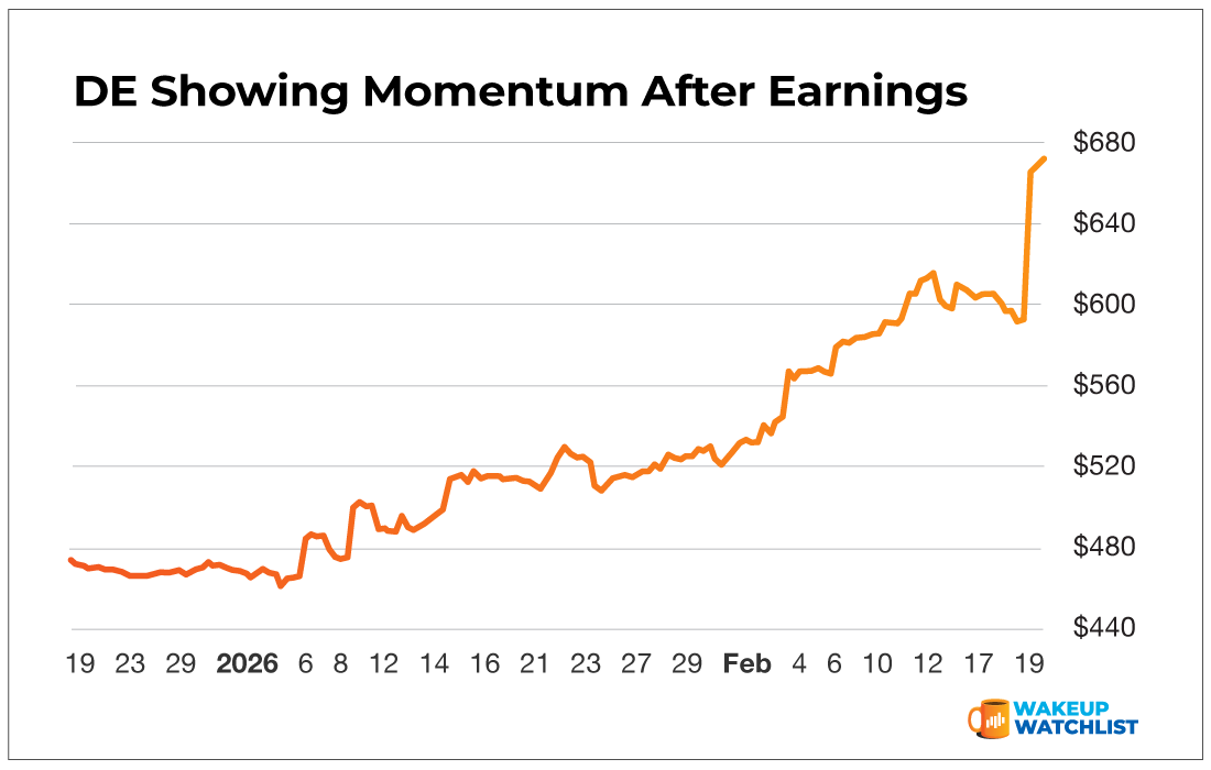 "When the trading environment gets frustrating, I have to remind myself that I can only control what I can control." Nate Bear, Lead Technical Tactician, Monument Traders Alliance This week is OPEX week. If you're unfamiliar with OPEX, it stands for "Options Expiration." It's when a large volume of options and futures contracts expire on financial markets, usually on the third Friday of every month. In my experience, OPEX week can be a frustrating environment for traders. In fact, the last 4 consecutive February OPEX weeks have been bearish for the markets, and 2026 is no different. The S&P and the Dow were both roughly 0.3% yesterday, with the Nasdaq off about 0.4%. When a week like OPEX flips indexes bearish, I always tell myself… "I can't control the indexes" "I can't make them do what I want." However, I can be patient and only trade chart setups I love, and there's one group I'm watching that's currently flying high despite OPEX frustration. That ticker is Deere & Company (DE). Here's why I like DE right now. DE crushed earnings yesterday. As you'll see above, it's spiking with a 13% pop. With its upward momentum against a choppy market, DE is a prime candidate for what I call a "lotto" trade. Every Friday, I look for lotto trades that capture short-term momentum of a company like DE. These trades have the potential to lead to fast gains. |