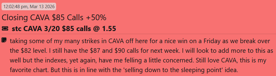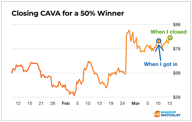 "After the continued break on CAVA Friday, I closed the trade for a 50% gain." Nate Bear, Lead Technical Tactician, Monument Traders Alliance Publisher's Note: We're just two days away from Bryan Bottarelli's "Stock Flip Fortunes" event. Early beta testers are already cashing in on this new strategy, with one member reporting as much as 87% on Home Depot (HD) overnight! Don't miss your opportunity to see all of Bryan's top stocks for flipping this Wednesday. Click here to sign up for FREE today. - Stephen Prior, Publisher Hey gang, Last week I wrote about CAVA Group in the Wake-Up Watchlist. I liked its chart for two reasons… For one, it closed strong after earnings in early March. This made a prime candidate for a continued surge. Second, it was ignoring the Iran selloff that was hampering so many other stocks. So with no macro headwinds dragging it down, I got positioned on the CAVA calls with the expectation that its momentum would continue. And last Friday, we got that continued break over the $82 level. The result was a 50% gain in 3 trading days. That's how I play post-earnings surge tickers for winners. If you caught this CAVA gain from last week's watchlist, click the thumbs up in the bottom of this email and let me know how you did in the feedback section. If you missed the CAVA trade, don't worry. I have several charts I'm looking at for trades heading into this week. Click the image below to get my latest watchlist plays. |