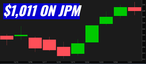 The stochastics were crossing over, indicating it wasn't a good time to buy yet. | Then December 15th came, and JPM got flagged as the #1-ranked income opportunity market-wide. A quick trade on JPM delivered $1,011 on a $2,500 stake in 11 days. |