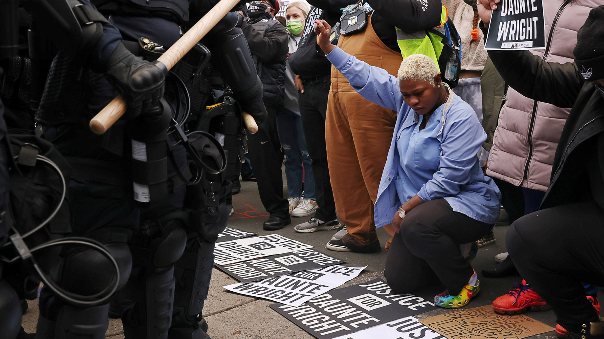 | | Protesters outside the police station in Brooklyn Center, Minn.Joshua Rashaad McFadden for The New York Times |