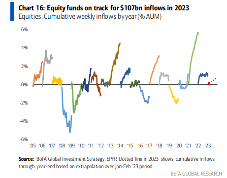 Equity funds are on track for $107bn inflows in 2023. |  | Bottom line: let that sink; $107bn is billions of dollars flowing to equities.